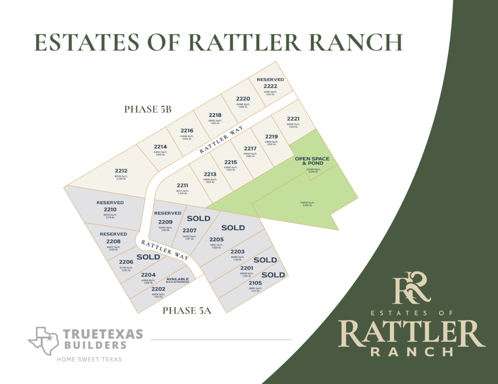 Ready to claim your spot at Estates of Rattler Ranch? Homes in this community range from $500K–$600K and sit on spacious, tree-filled lots that offer privacy, views, and plenty of room to build your Texas dream. Whether you’re looking for a lot with pond views, extra trees, or the perfect place for your shop and outdoor space, you can explore all available homesites on our lot map. Take a look and find the piece of land that feels like home.